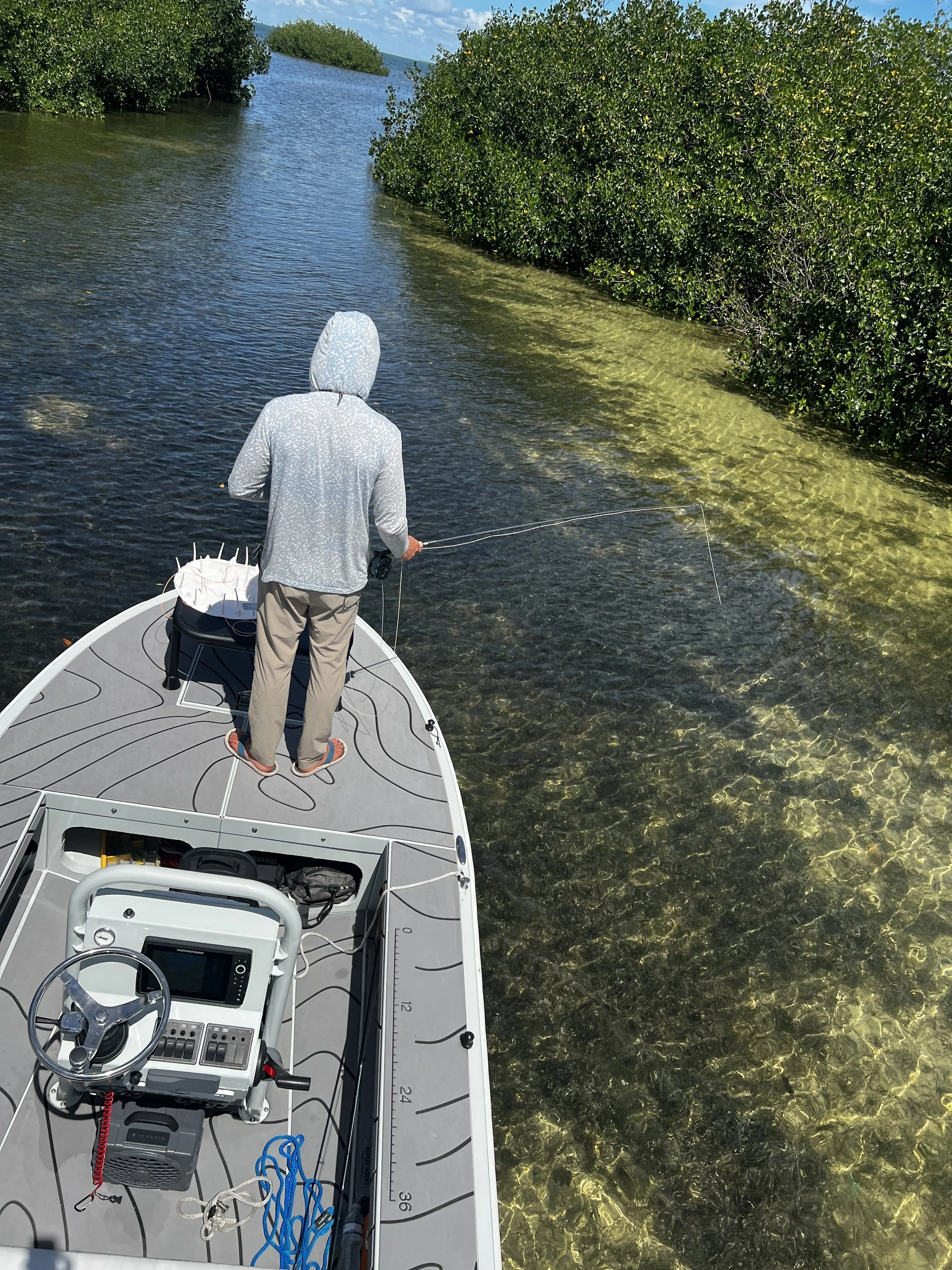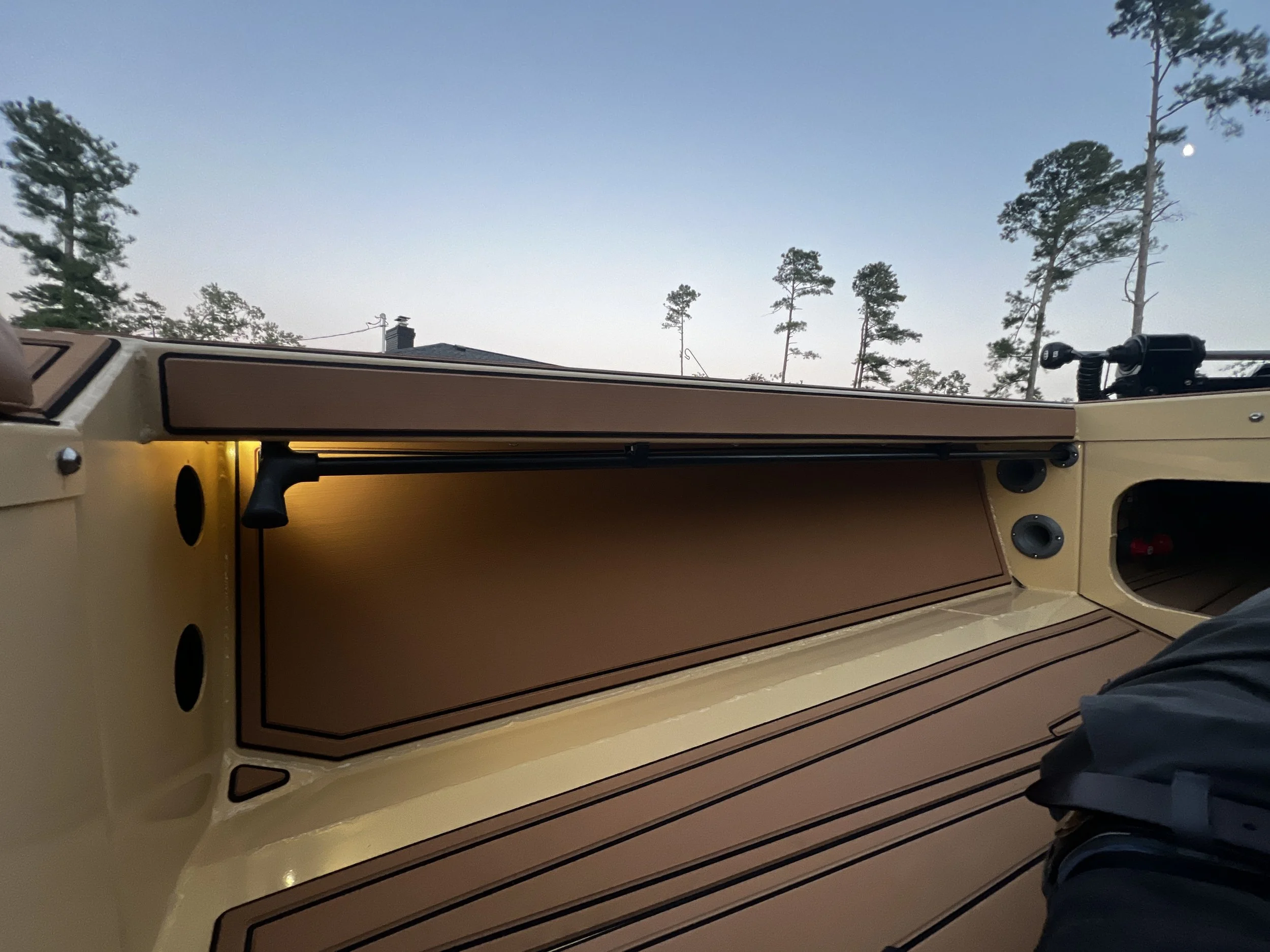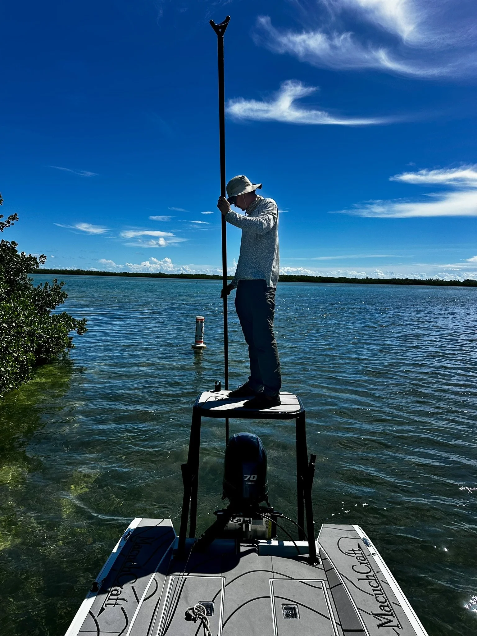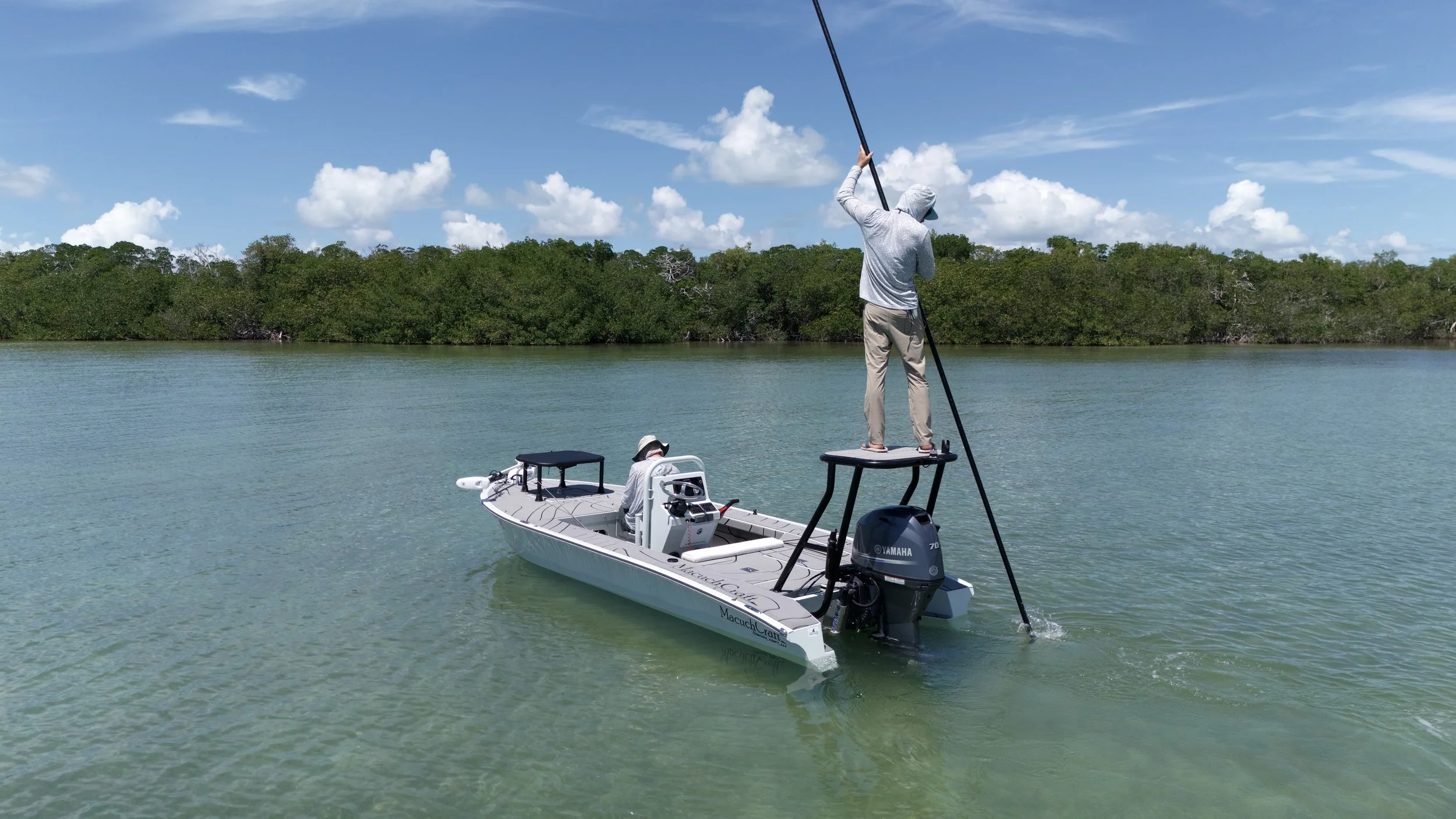 Measuring 17’5” in length with a generous 77” beam, it boasts expansive forward and aft casting decks, wide walkable gunwales, and ample space for three adults to fish in comfort. Despite its size, it draws less than 10” of water when fully loaded for a day on the water.