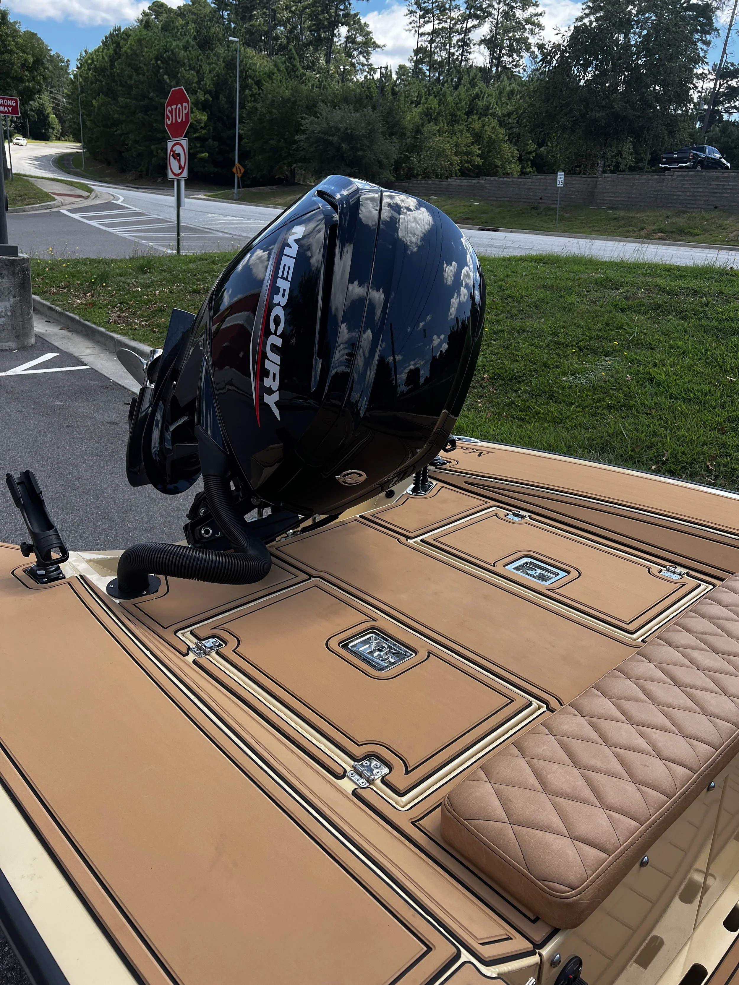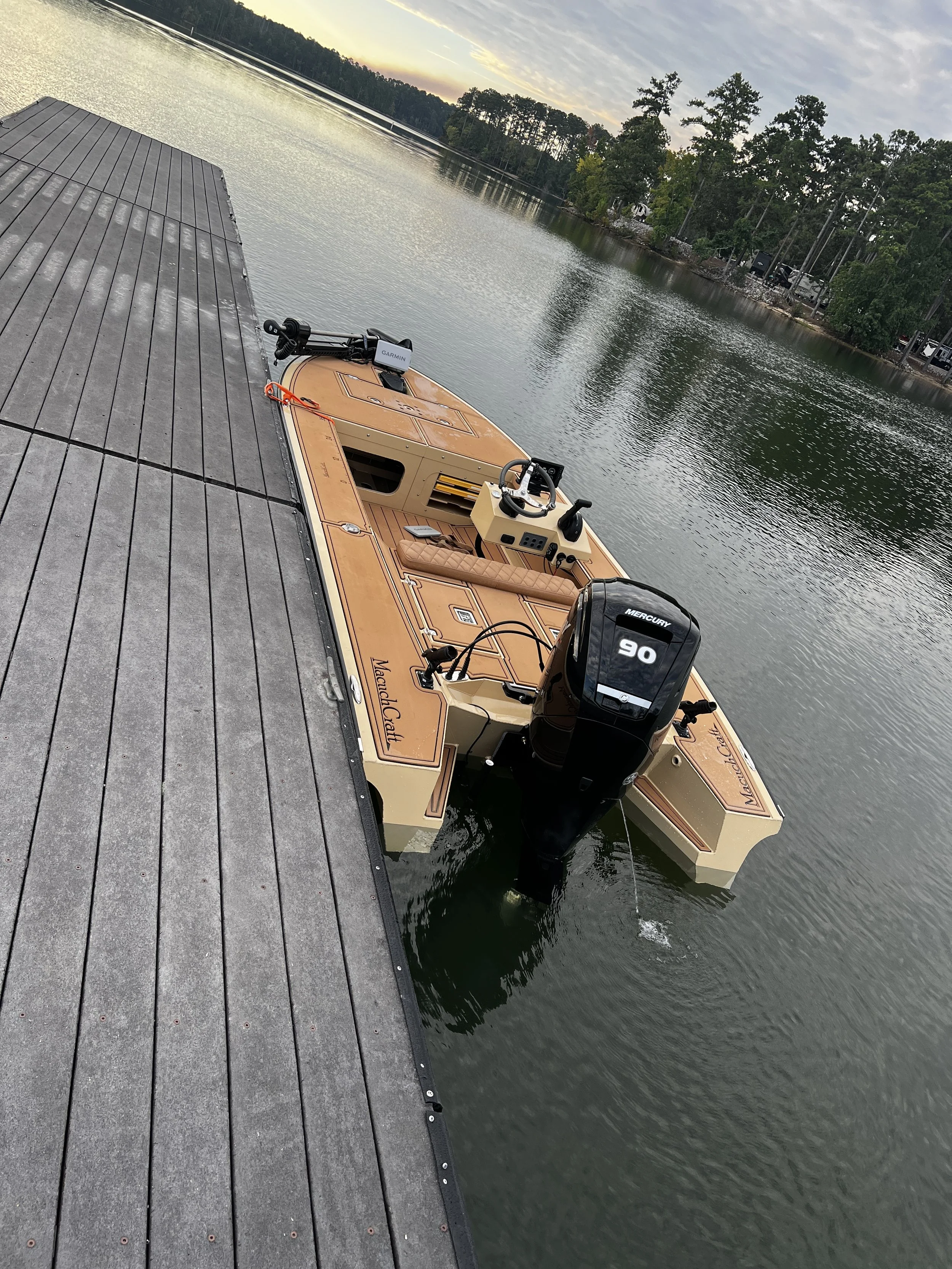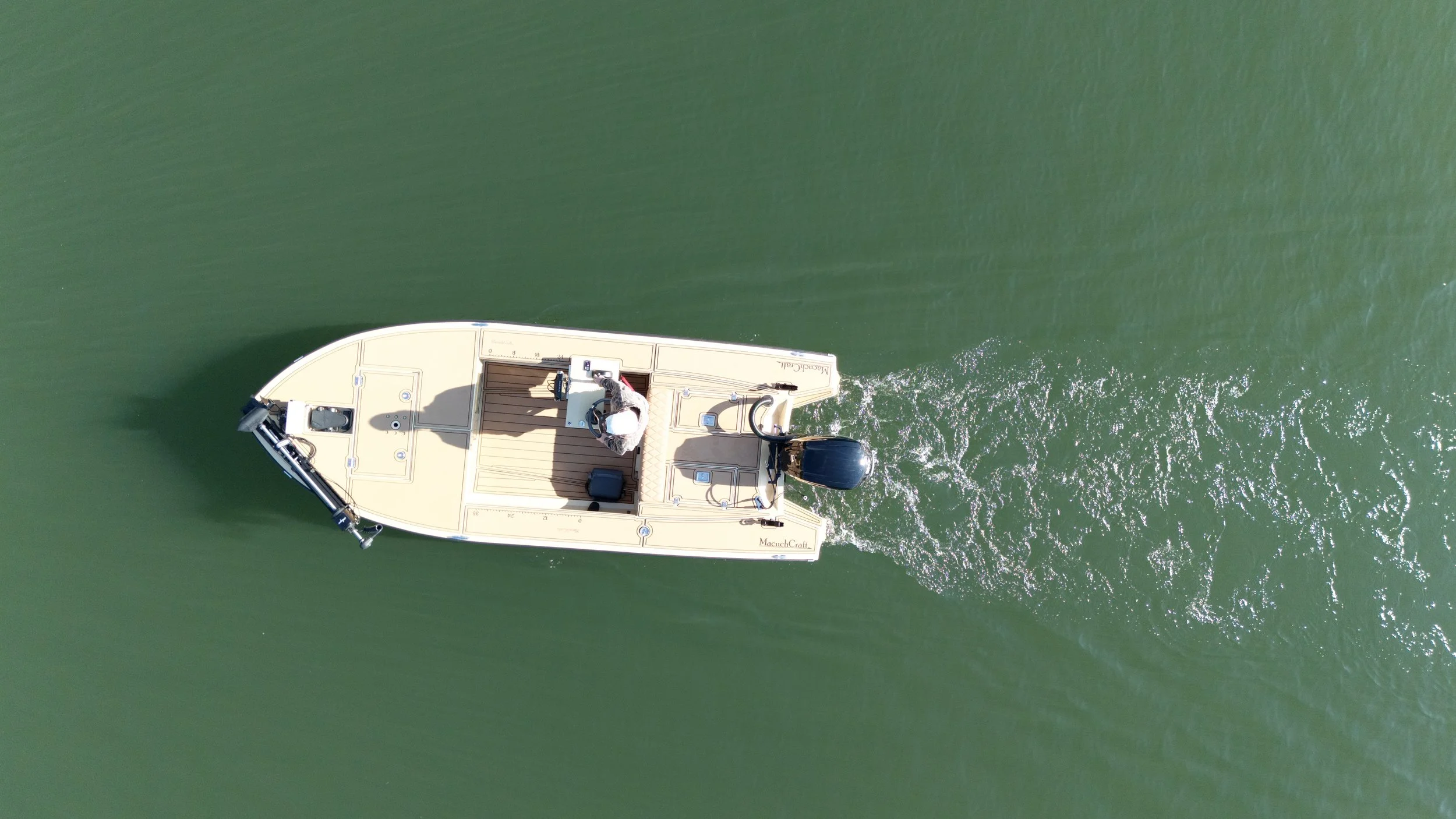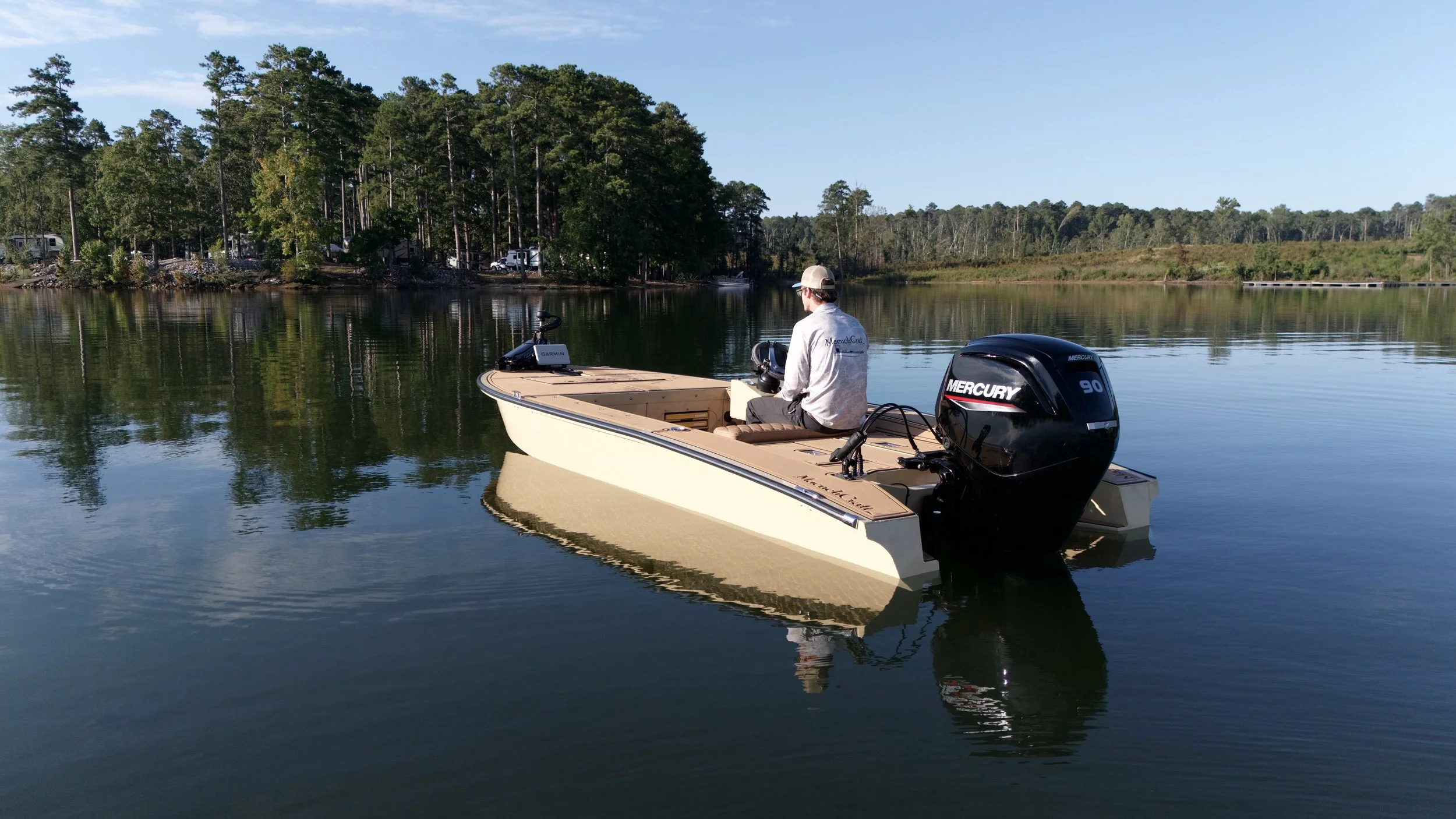 A sharp 28˚ keel deadrise transitions to 10˚ at the transom, delivering a smooth, confident ride through bay chop. Wide reverse chines enhance lift, add stability, and deflect spray downward for a drier ride. Seamlessly integrated float pods with built-in boarding steps reduce draft while improving holeshot performance.
